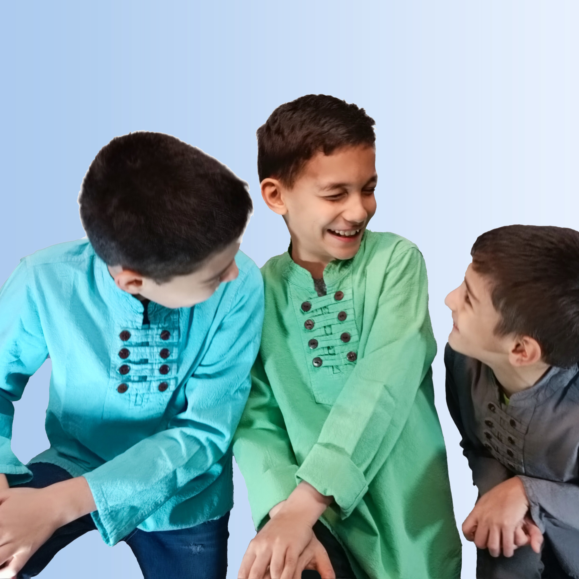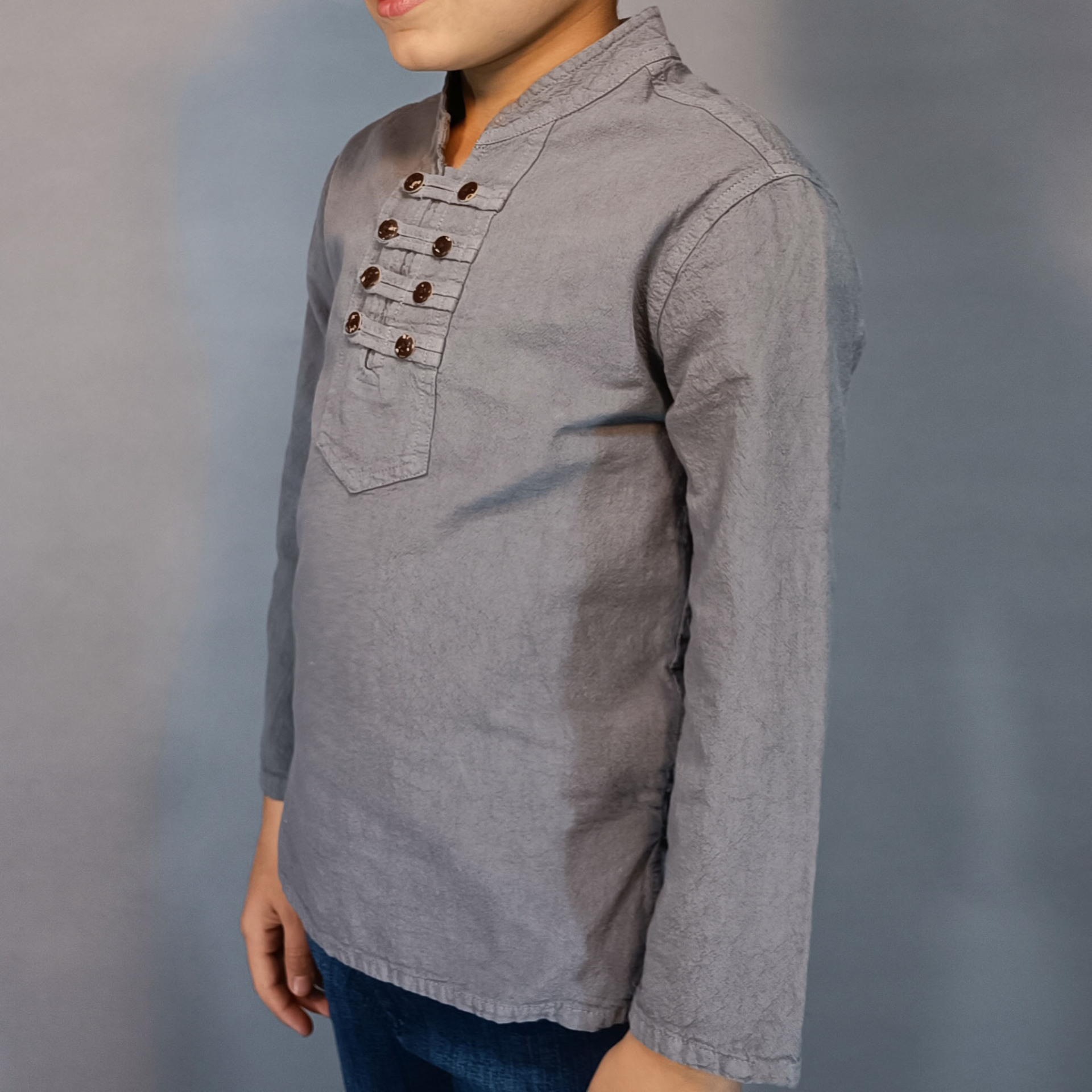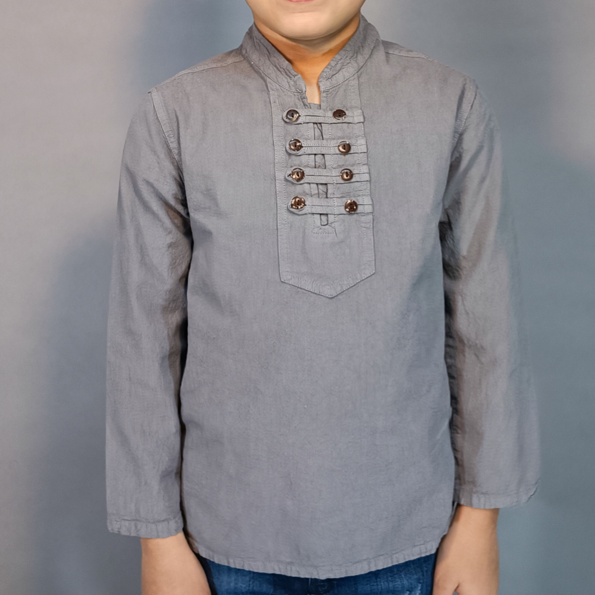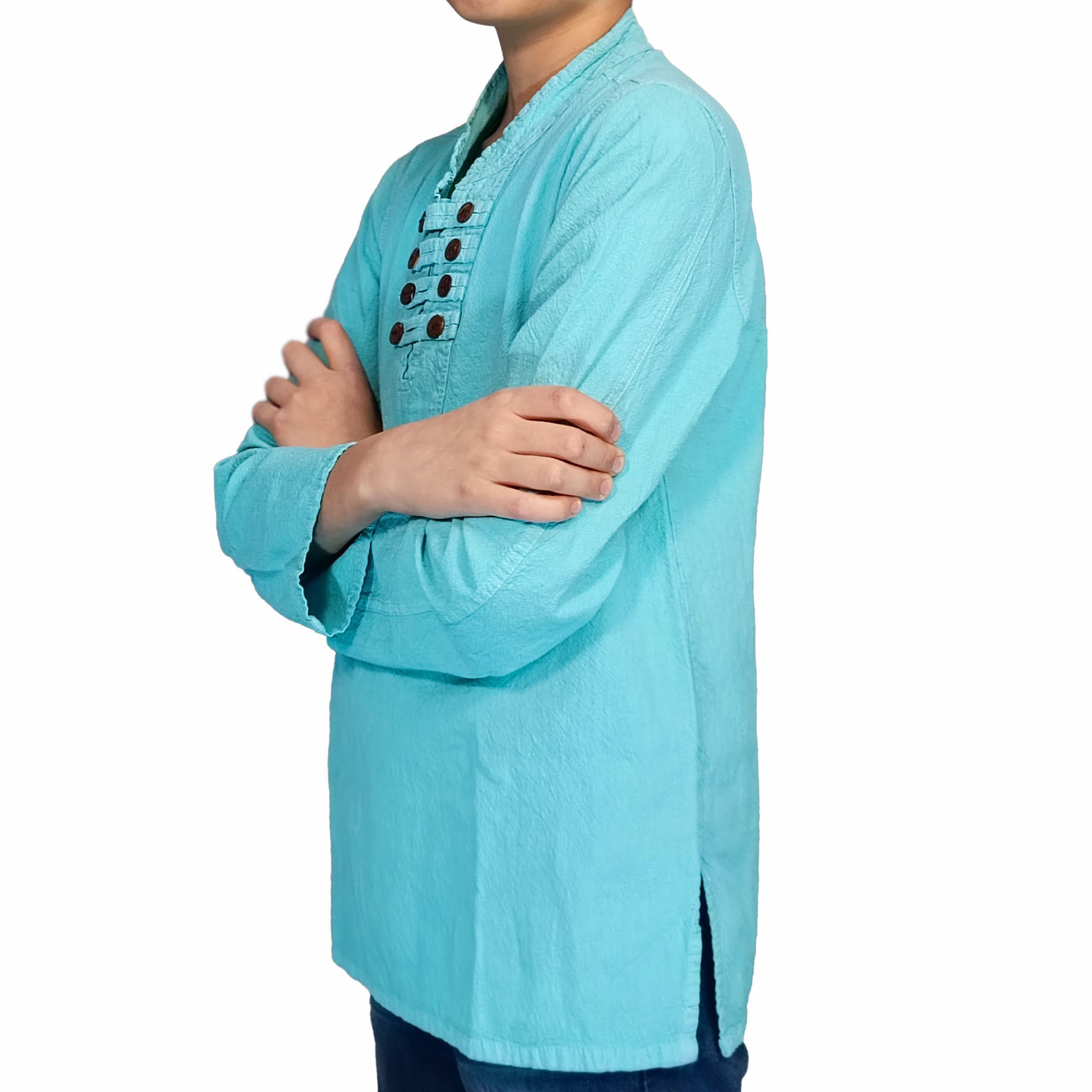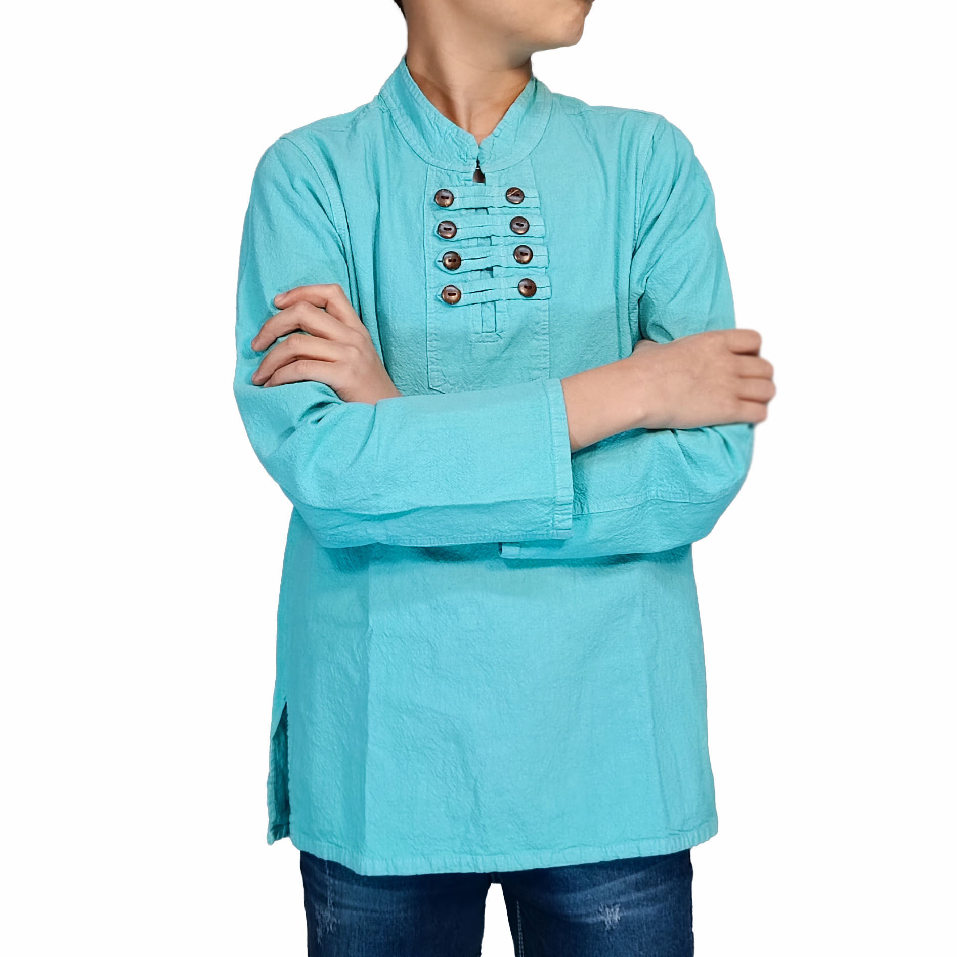 پیراهن پارچه الیافی بچگانه هشت دکمه رنگ نسکافه ای/آبی فیروزه ای/طوسی
