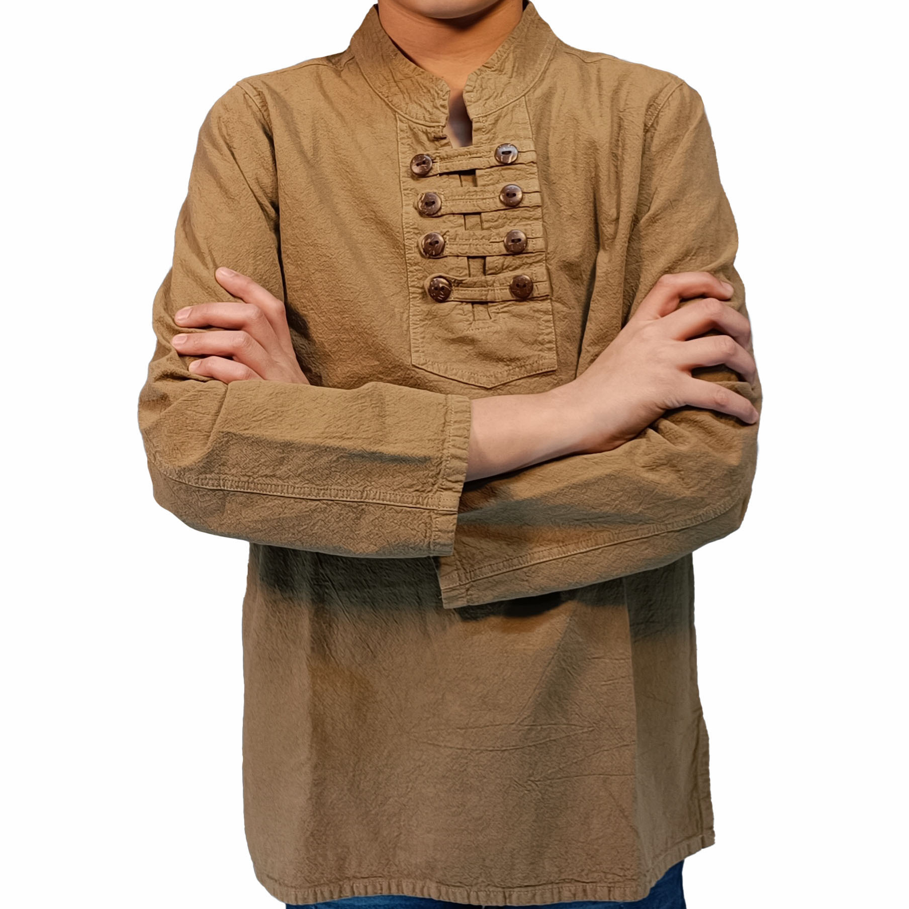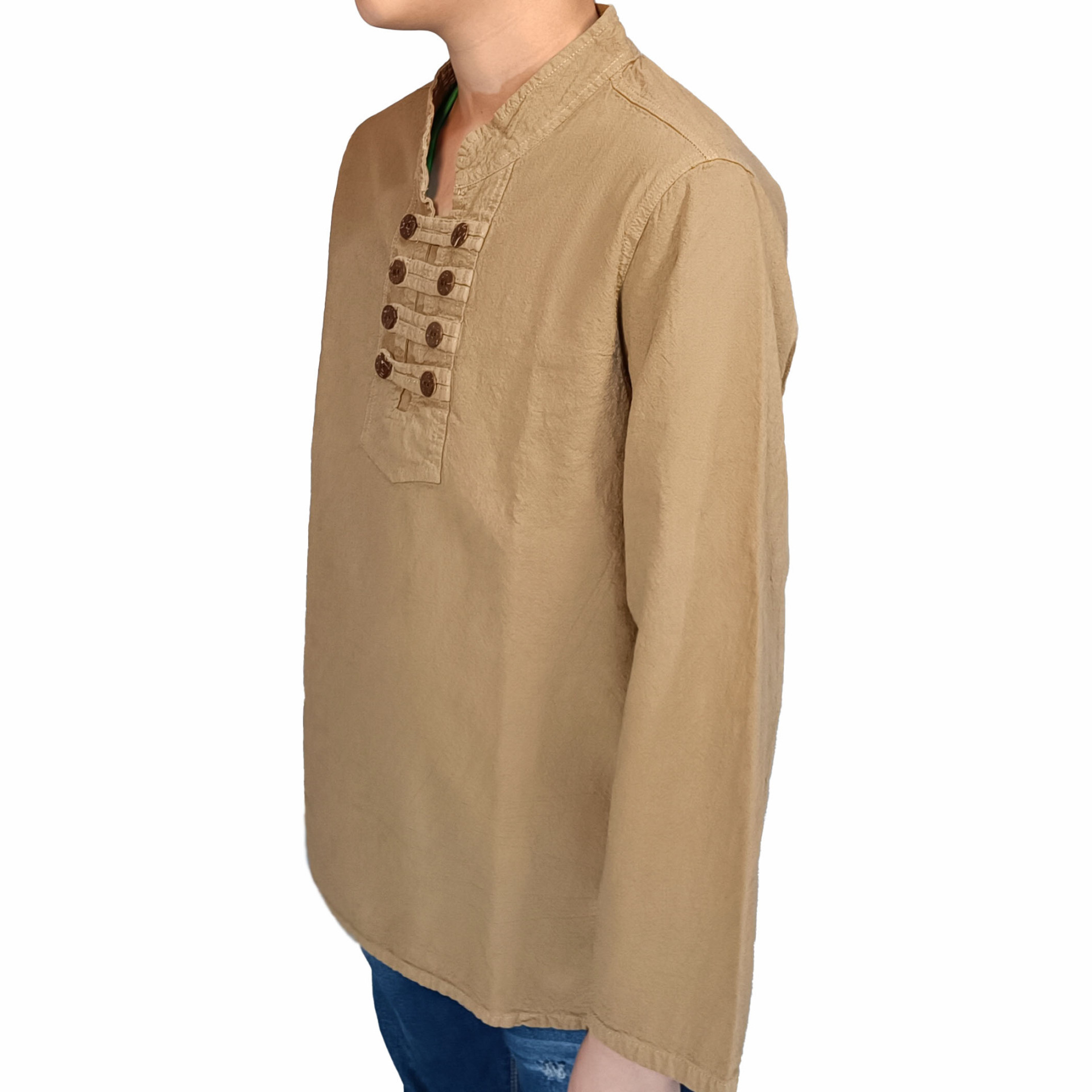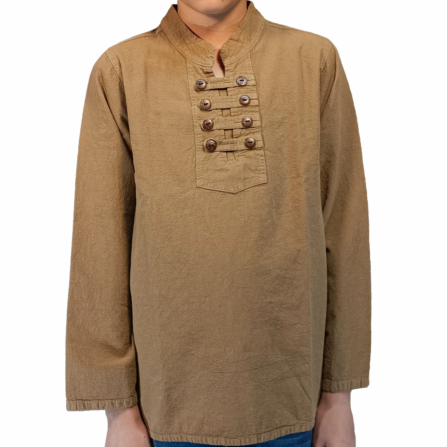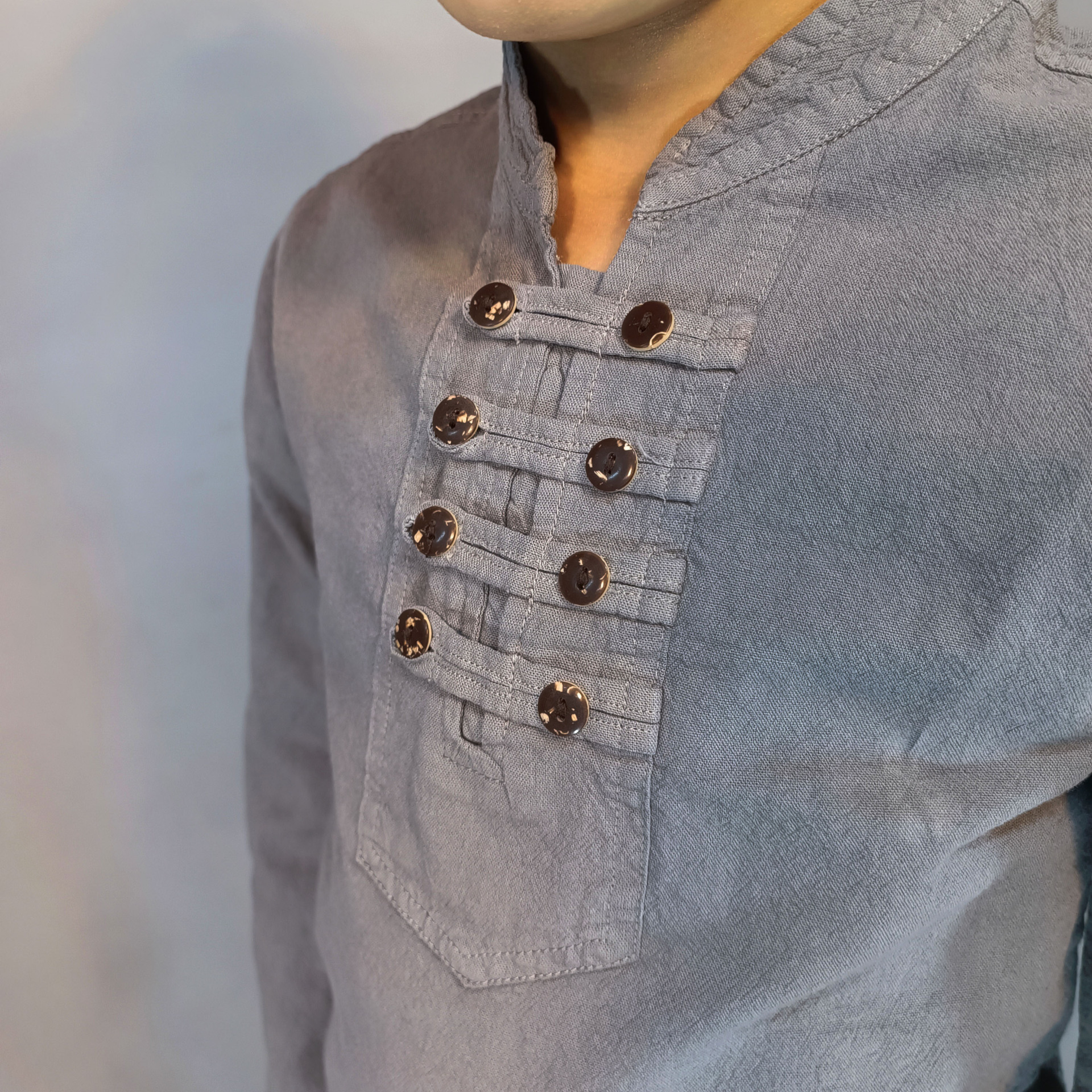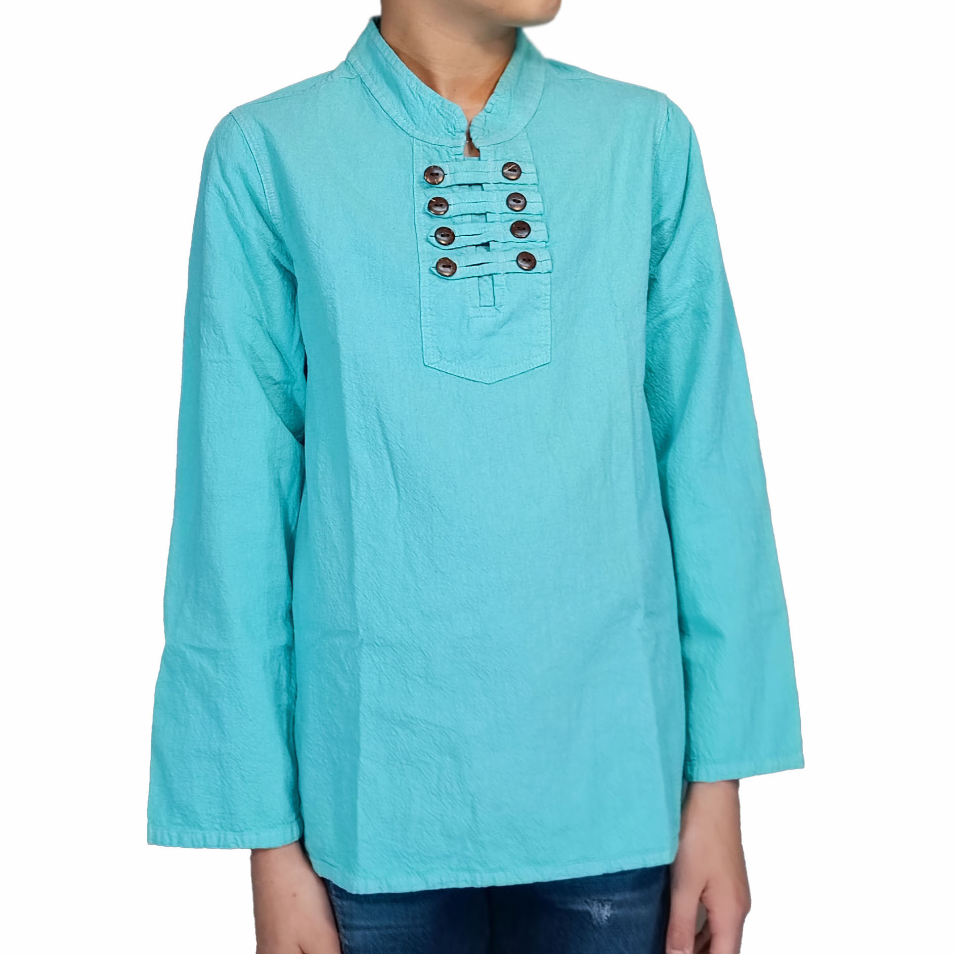 پیراهن پارچه الیافی بچگانه هشت دکمه رنگ نسکافه ای/آبی فیروزه ای/طوسی